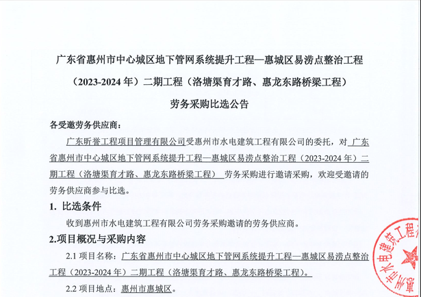 廣東省惠州市中心城區(qū)地下管網(wǎng)系統(tǒng)提升工程-內(nèi)街小巷排水管網(wǎng)病害修復(fù)及錯(cuò)混接改造項(xiàng)目一期施工勞務(wù)采購(第二次)中選候選人公示……